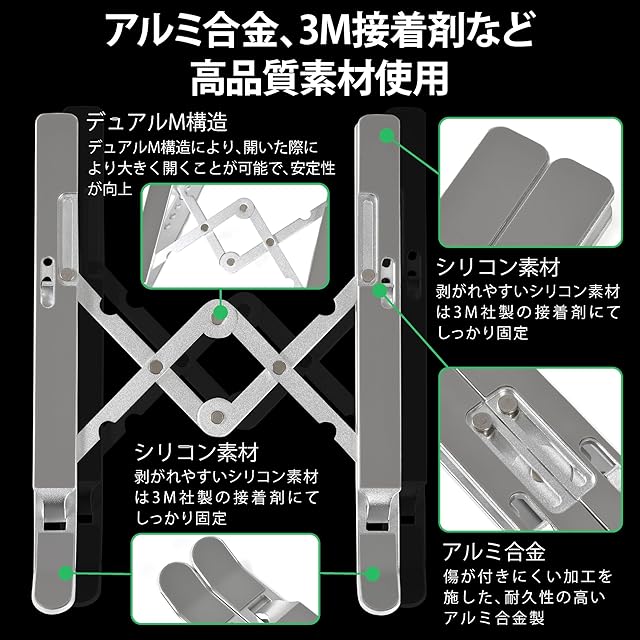 ⭐ダブル開閉機構で大きく開くことによる安定性の向上:開閉部分を折り曲げて長くとることで、開いたときに最長18cmになり、ノートパソコンを載せた際の安定性が向上