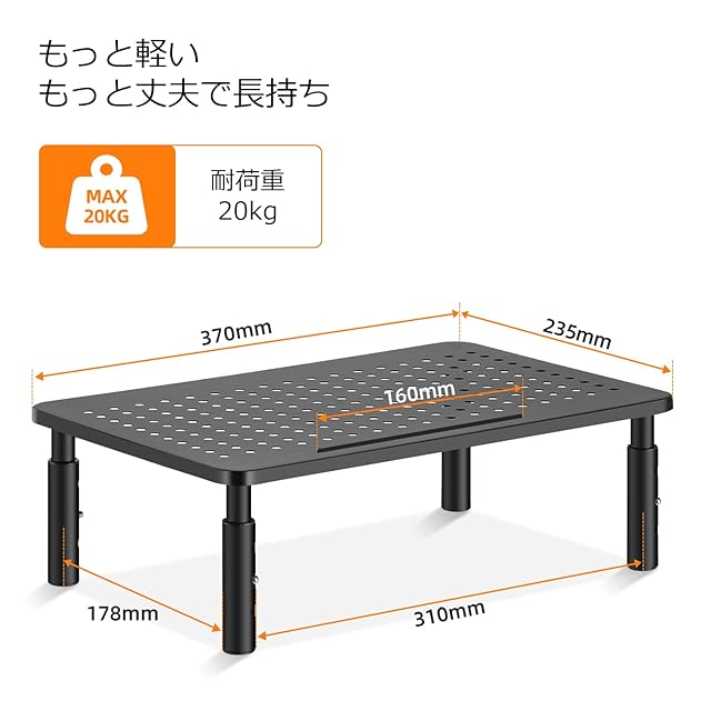 【丈夫で安定性抜群】頑丈なスチール製で、しっかり物を支えます。脚の下部にはゴムパッドがあるので、滑り止めることができて、傷を防止することもできます。20kgまでのノートパソコンとモニターを載せることができます。