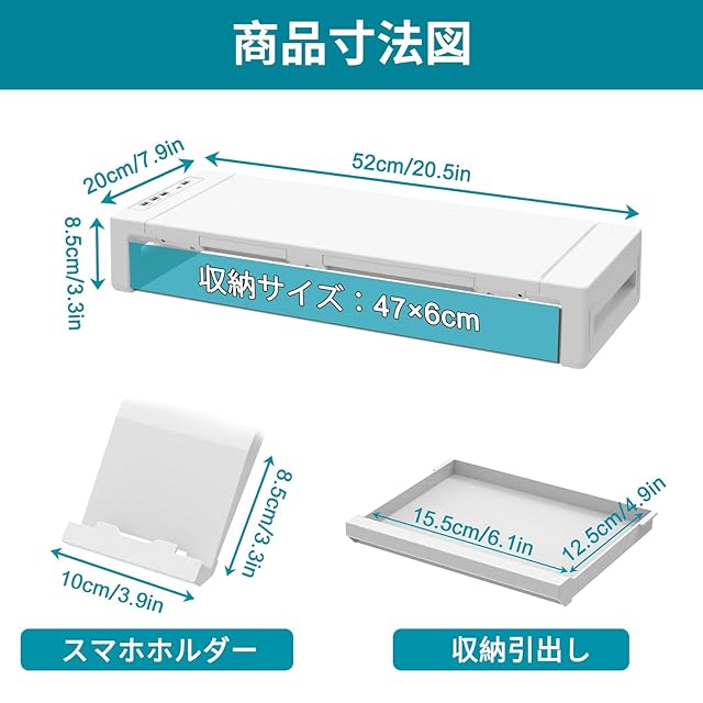 商品名:EAYHMモニター 台 卓上 USBドッキング付き PC 机上 台 USB/TYPE-C急速充電対応 折りたたみ可能 パソコンスタンド 引き出しとスマホホルダー付き パソコン 台 幅3段階可変モニタースタンド 耐荷重25Kg (白-USBドッキング付き)