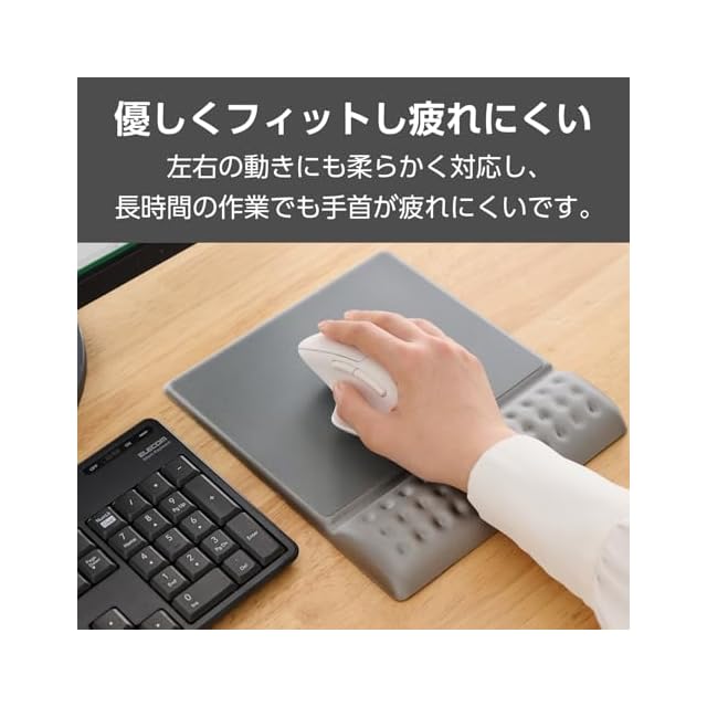 リストレスト部には優しく手首にフィットする低反発ポリウレタンを採用。左右の動きにも柔らかく対応し、長時間のパソコン作業でも手首が疲れにくいのが特長です。マウス操作面は一定の硬さがあり、沈みにくくスムーズで軽いすべり心地です。