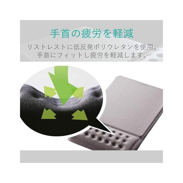 圧力に対して復元速度が遅いため、優れた荷重分散性能を有しており、手首の形状にフィットし長時間のPC作業をサポートする。