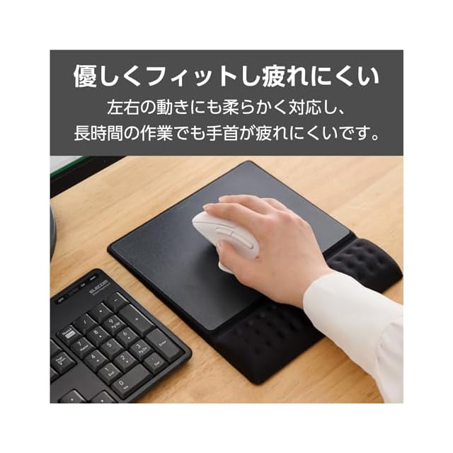 リストレスト部には優しく手首にフィットする低反発ポリウレタンを採用。左右の動きにも柔らかく対応し、長時間のパソコン作業でも手首が疲れにくいのが特長です。マウス操作面は一定の硬さがあり、沈みにくくスムーズで軽いすべり心地です。
