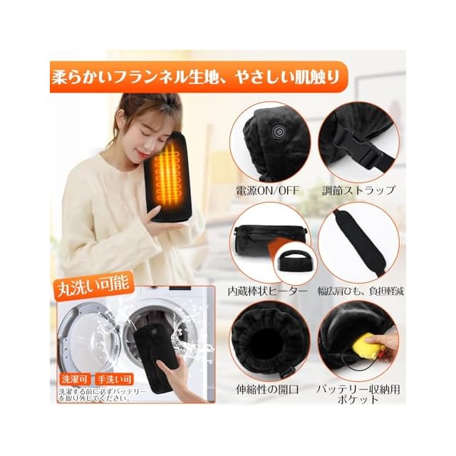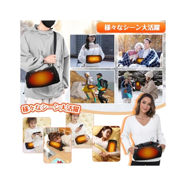 【持ち運び便利・様々なシーン大活躍】電気ハンドウォーマーには調節可能なショルダーストラップが付いており、カラビナで着脱できる。モバイルバッテリーに接続して使えるので、オフィスなどの屋内での利用はもちろんのこと、行楽シーズンでのレジャーやアウトドアでも気軽に持ち歩いて利用できます。ハンドウォーマー、フットウォーマーやなどとして、お手、肩、腰、お腹、お尻、膝、足元などを温め。湯たんぽの裏は収納ポケット2つがあって、バッテリーでけでなく、小銭、カギ、カード、などもいられて、収納らくらく!