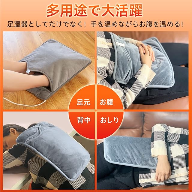 【お肌に優しい生地・優れた保温性・洗濯可能】この電気足温器は暖かくて、超柔らかな肌触りが魅力の「マイクロプラッシュ(Microplush)」を採用します。「マイクロプラッシュ(Microplush)」は、柔らかいビロードのような繊維が特徴です、 繊維の中に空気を含んで熱を逃さないので、フリースよりも保温性に優れています。手洗いだけでなく、洗濯機で丸洗いできます。洗える前に、ヒーターのプラグ部分を抜いて、カバー部分の洗濯可能です。(コントローラーをや電源コードの洗浄はできません。)