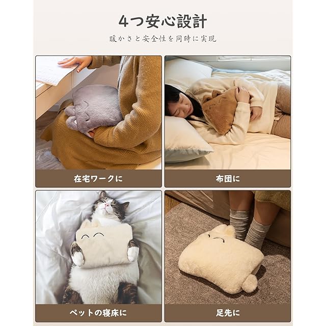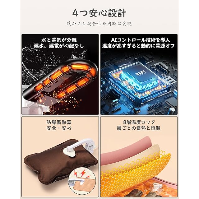 【4つ安心設計・暖かさと安全性を同時に実現】安全第一の設計、高い技術力が融合された湯たんぽの秘密は?①「水と電気」を分離し、水漏れや漏電の心配がありません。火傷を防ぎユーザーの安全を守る。②「過充電防止機能」を搭載しており、充電をしたまま忘れてしまっても、充電終了とともに電源が切れます。長く使いたい方も、普段忙しい方も安心です。③「温度コントロールセンサー」を内蔵し、実際の発熱温度を監視できます。過熱時には自動電源オフ。④「内容液は腐食性がない」ので、清潔で無臭である。さらに、火やお湯を使わないため、特にお子様やペットがいるご家庭でも、安心して利用できます。安全面を気にせず、温かい冬を楽しむことができます。