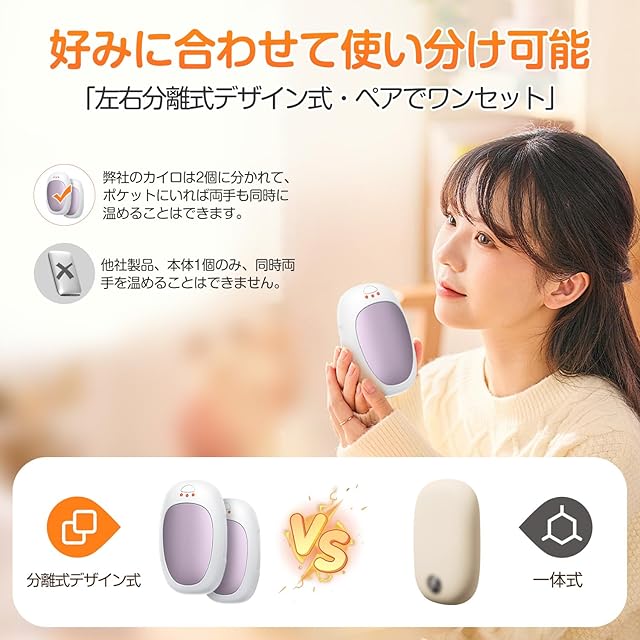 【分離式デザイン式・ペアでワンセット】分離式な 充電式カイロ は実現した!一つは手を暖めながら、もう一つは他のデバイスを充電することもできる。また、外出時に左右の手を別々に暖められるほか、片方だけ持ち歩いて荷物がかさばっても握りやすい。寒い冬に手足を温めてくれ、暖かさをもたらします。長時間お待たせなく、いつでもどこでも優しい温もりを与えてくれます。冷え性の方や寒さに弱い方が冬を快適に過ごすために最適な防寒グッズです。