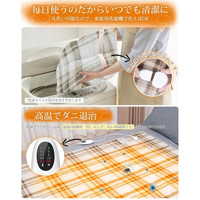 【洗濯機で丸洗いOK&ダニ退治】自宅で洗濯が簡単、コントローラーを取り外し、電気毛布を洗濯ネットに入れて、洗濯機で丸洗い可能。温度段階が「P5」に設定され、0.5~1時間ほど置いて、ダニを消滅でき、抗菌·除臭を実現します。しかも洗濯機で洗濯できるので、いつでも清潔にお使いいただけます。