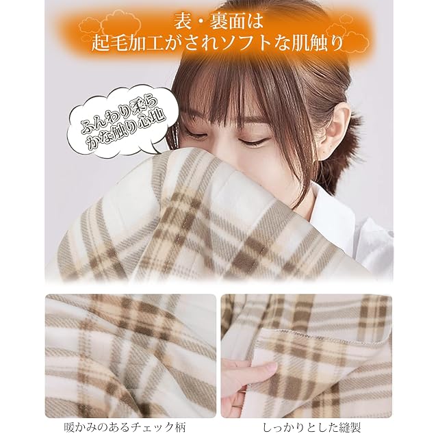 【心地良い質感・優れた保温性】電気毛布は暖かみのある両面チェック柄を採用。ふんわりと包み込んでくれるような生地で、すぐじんわりと暖かくなります。優れた縫製技術のおかけで、極細繊維がちゃんと詰まっていて、肌触りだけでなく、毛玉ができにくい素材、高い保温性、速乾性と耐久性を兼ね揃えます。寒い季節に冷えたベッド・ふとんや身体をぽかぽかにあたため、心地よい眠りに導いてくれる電気毛布。