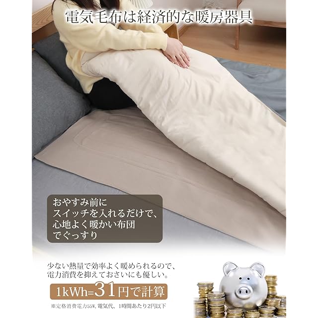 【55Wで速暖・電気代がとってもお得】電気毛布は経済的な暖房器具です。最大消費電力55Wで、1時間あたりの電気代は約0.9円、他の暖房器具と比較して低い消費電力であり、電気代の節約に繋がります。断熱性の高い布団を使うと、より温かくなり電気代の節約にもなります。こちらの電気毛布は配線を工夫し足元を重点的に暖める足元ポカポカ設計、頭寒足熱配線となっております。腰回りから足元までが冷えてなかなか眠れない方におすすめの電気毛布です。フローリングや畳からの底冷えもしっかりシャットアウトします。冬の寒さ対策だけでなく、春や秋の少し肌寒い時期、そして夏場の冷房による冷え対策としても一年中活用できます。