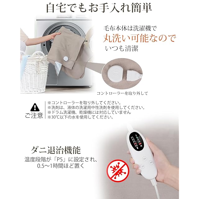 【洗濯機で丸洗いOK&ダニ退治】自宅で洗濯が簡単、コントローラーを取り外し、電気毛布を洗濯ネットに入れて、洗濯機で丸洗い可能。温度段階が「P5」に設定され、0.5~1時間ほど置いて、ダニを消滅でき、抗菌·除臭を実現します。しかも洗濯機で洗濯できるので、いつでも清潔にお使いいただけます。(※乾燥機には対応していません)