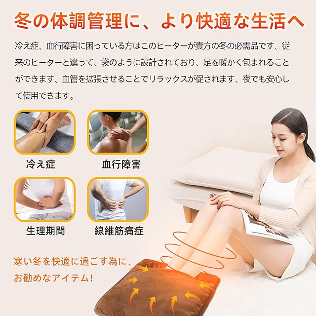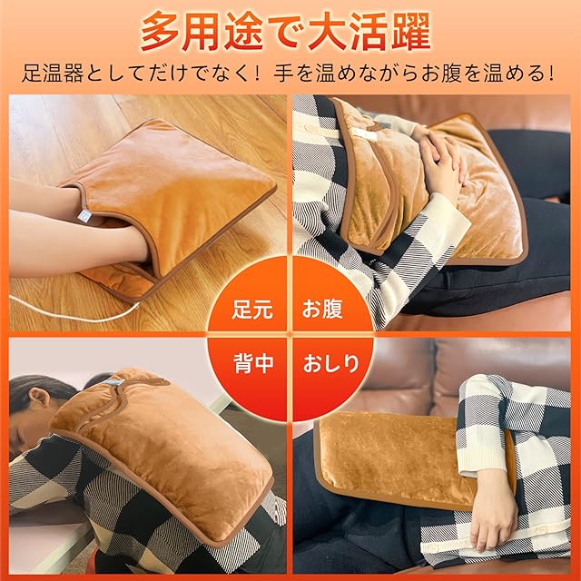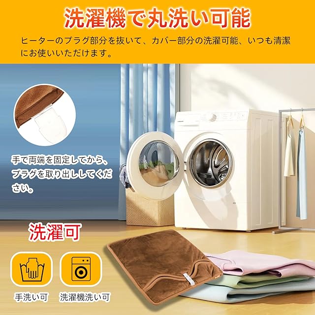 【お肌に優しい生地・優れた保温性・洗濯可能】この電気足温器は暖かくて、超柔らかな肌触りが魅力の「マイクロプラッシュ(Microplush)」を採用します。「マイクロプラッシュ(Microplush)」は、柔らかいビロードのような繊維が特徴です、 繊維の中に空気を含んで熱を逃さないので、フリースよりも保温性に優れています。手洗いだけでなく、洗濯機で丸洗いできます。洗える前に、ヒーターのプラグ部分を抜いて、カバー部分の洗濯可能です。(コントローラーをや電源コードの洗浄はできません。)