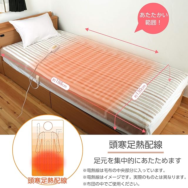 【温まる範囲について】こちらの電気毛布は、頭側から38cm、足側から30cmには電熱線は入っておりません。電熱線が入っている部分は中央部分になります。なぜ電熱線が入っていない部分を多くしたかというと、寝ている間に毛布がずれてしまうことがないように電熱線が入っていない部分を布団に折り込み、ずれにくくするためです。また、折り込まなくても温まらない部分の面積を増やすことによって、寝返りをうっても毛布がずれにくくなるという効果もあります。敷き毛布として使った場合では、身長160cmの方でおよそ足先から胸までが温まります。掛け毛布として使った場合には、身長160cmの方でおよそ足先からお腹までが温まります。※個人差があります。下半身を重点的に温めたい方におすすめします。