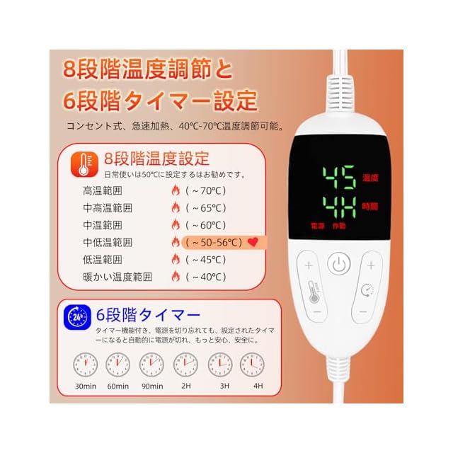 【2025新登場 BILIWAL足温器】 1.8段階温度調節:階段/温度(1:40℃/2:45℃/3:50℃/4:53℃/5:56℃/6:60℃/7:65℃/8:70℃) 2.6段階タイマー設定:30分/60分/90分/120分/3時間/4時間 3. 足、膝、背、お尻、手、お腹などを温めることも可能です。