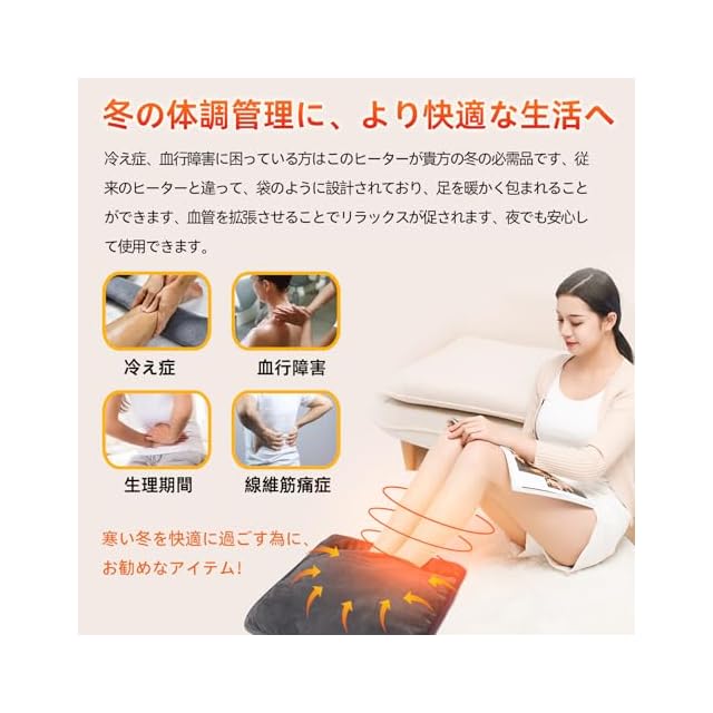 【お肌に優しい生地・優れた保温性・洗濯可能】この電気足温器は暖かくて、超柔らかな肌触りが魅力の「マイクロプラッシュ(Microplush)」を採用します。「マイクロプラッシュ(Microplush)」は、柔らかいビロードのような繊維が特徴です、 繊維の中に空気を含んで熱を逃さないので、フリースよりも保温性に優れています。手洗いだけでなく、洗濯機で丸洗いできます。洗える前に、ヒーターのプラグ部分を抜いて、カバー部分の洗濯可能です。(コントローラーをや電源コードの洗浄はできません。)