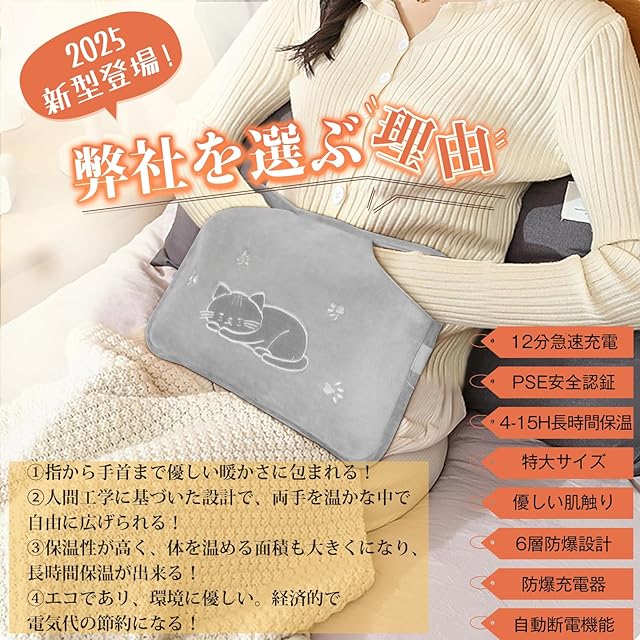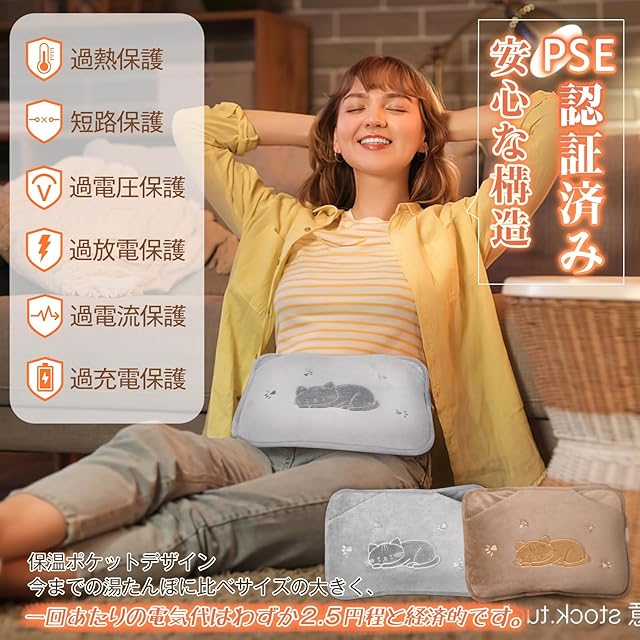 【PSE認証済み・防爆・6重保護搭載】➊PSE認証済み&METI経済省登録済み!安心安全にお使いいただけます。➋湯たんぽは高品質保温素材と高強度PVCの6層防爆設計を採用ております。❸過熱保護、短路保護、過充電防止、過放電保護、過電庄保護、過電流保護を備えた6重の保護システムがあり、防爆充電器で充電時は75℃以上を感知すると自動的に通電を停止します。繰り返し使える蓄熱式湯たんぽなので、お腹・背中・肩・手足のほか、首を温め、首の疲れを緩和することができ、就寝前やお出掛け前にも大活躍します。