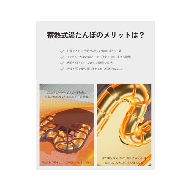 ✓水と電気を完全分離。「水のエリア」と「電気のエリア」を完全分断。漏電リスクを根元からシャットアウト!✓「過充電防止機能」を搭載しており、充電をしたまま忘れてしまっても、充電終了とともに電源が切れます。長く使いたい方も、普段忙しい方も安心です。✓ダブルAIガードチップ。70℃超えを0.1秒で検知→即時電源カット!「もう1つのチップ」がバックアップで二重保護。✓6層防爆シールドで叶える"究極の安心温活"。「内容液は腐食性がない」ので、清潔で無臭である。技術とやさしさが融合したぬくもりで、この冬をもっと安全に、もっとあたたかく。