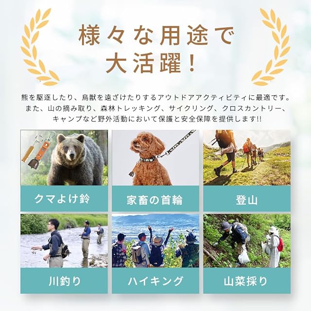 【幅広い用途】クマよけの鈴としてだけでなく、アウトドアキャンプ、登山、川釣り、ハイキングや山菜採りなど、山の中での活動にオススメです。また、犬、牛、羊、馬、家畜などの首輪ベルとしても使うことができます。多機能で便利な熊鈴を、ぜひ様々な場面でお役立て下さい。ご注意:本商品で熊との遭遇を完全に避けることはできません。
