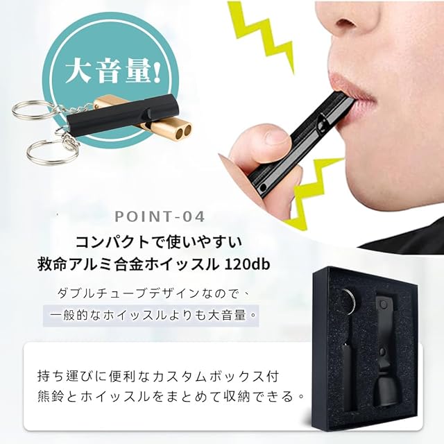 【製品仕様】熊鈴サイズ:約15.5cm*3.5cm 熊鈴重量:約30g/個 熊鈴材質:真鉄(熊鈴)+PU革(ベルト) 【セット内容】熊鈴(ブラック)*2、ホイッスル*2、収納ボックス*2。【救命ホイッスル】ダブルチューブデザインの防災用ホイッスルは、災害のときに要救助者の居場所を知らせるために必要な笛です。大音量の120dbなので、遠くからでもよく聞こえます。声を出すと体力がかなり消耗してしまうので、救助の声が聞こえたらホイッスルを吹くことで自分の居場所を知らせることができます。また、熊鈴とホイッスルをまとめて収納できるカスタム仕様の「ボックス」を付属しているので、見た目と肌触りで高級感を演出する。※モニター環境により、実際の商品の色合いと多少異なってみえる場合があります。ご注意ください。