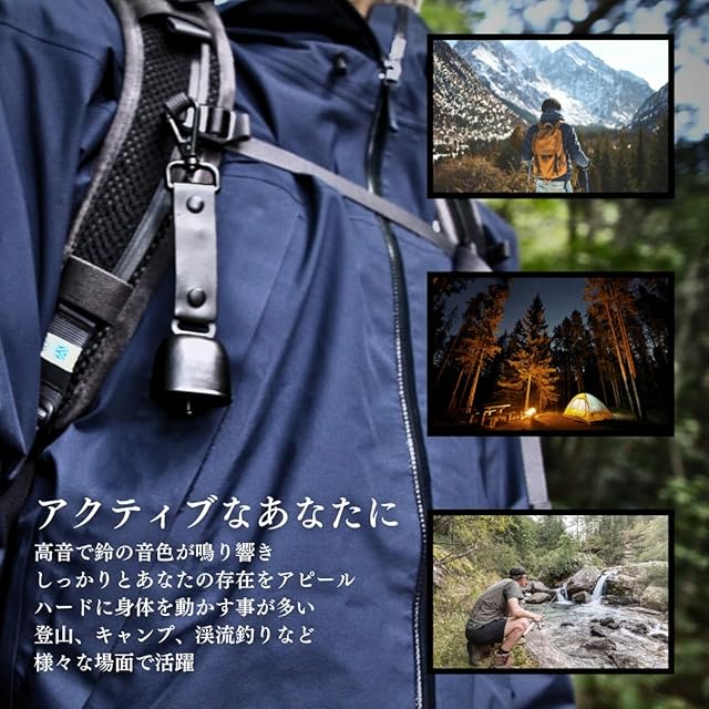 「心地よい音色」高品質な鉄製鈴を採用し、遠くまで響く高音域の音色で熊に人の存在を知らせます。クリアで遠達性の高い音色が樹木の多い環境や風の音、渓流の音にも負けず、人の耳には心地よく、熊には驚かせることなく確実に届く絶妙な音量設計を実現しています。