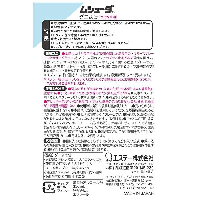 【ダニよけ成分 天然100%】天然ピレトリンがダニをよせつけません。
