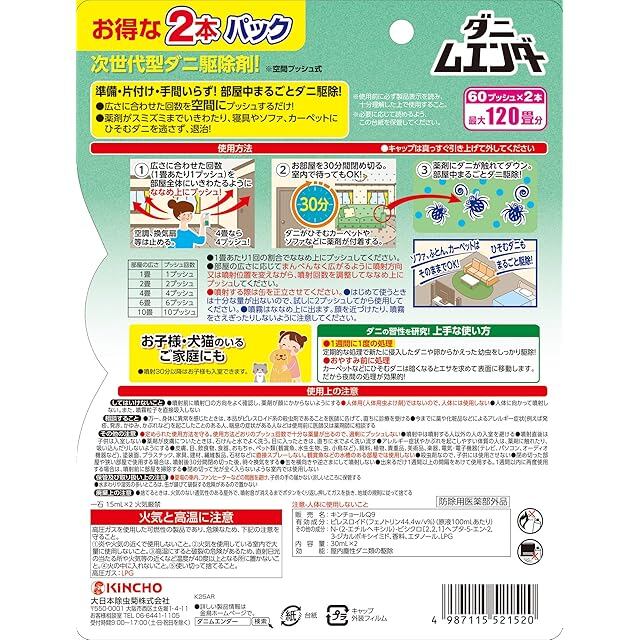60プッシュ×2本 最大120畳分。低刺激。お子様・犬猫のいるご家庭にも。次世代型ダニ駆除剤!※空間プッシュ式。準備・片付け・手間いらず!部屋中まるごとダニ駆除! 広さに合わせた回数を空間にプッシュするだけ!薬剤がスミズミまでいきわたり、 寝具やソファ、カーペットにひそむダニを逃さず、退治!