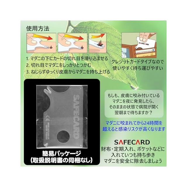 商品名:【医療品質】誰でも簡単 SAFECARD マダニ取り|回すと危険!世界の研究報告が警告 WHO 国際保健機関準拠=回さず除去 無理やり引っ張らない!CE認証 クレカサイズ 人・犬・猫兼用 SFTS対策 (簡易パッケージ)