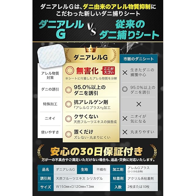 天然フルーツエキスを成分にした誘引剤でダニを誘き寄せる臭くないダニ捕りシートです。シートには抗アレルゲン剤「アレルGプラス」で表面加工を施し、付着したダニ由来の特定タンパク質(アレル物質)を低減致します。ダニを減らし、アレル物質を抑制することでダニ対策の効果を発揮する商品です。