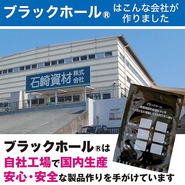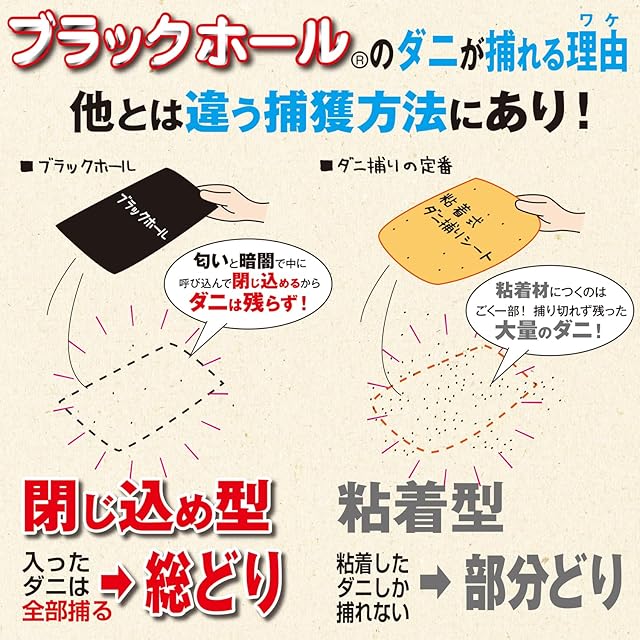 【ダニの習性を利用したダニ捕りパック】ブラックホールは明るさを嫌うダニの習性(背光性)を利用した、閉じ込め型のダニ捕りパックです。ダニの好きな香りでまとめて呼び込んで、広範囲のダニを捕獲。1か月ごとに設置場所を1m以上移動すると効果的な捕集が期待できます。
