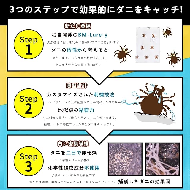 独自開発のBM-Lure-y は、天然植物の香りを巧みに利用してダニを誘引します。独特な刺繍技法,ダニを二日で即乾燥。これまでのダニ捕りシートはダニを捕えてもダニが活動し続けることで排泄物や卵を産み、それらが外に出てしまったことも。しかし、乾燥タイプのダニ捕獲ラボは、80%以上が水分で含まれているダニを乾燥させることで2日で急速に弱体化させます。※化学性殺虫成分を一切利用していないので、子供やペットにも安心安全です。