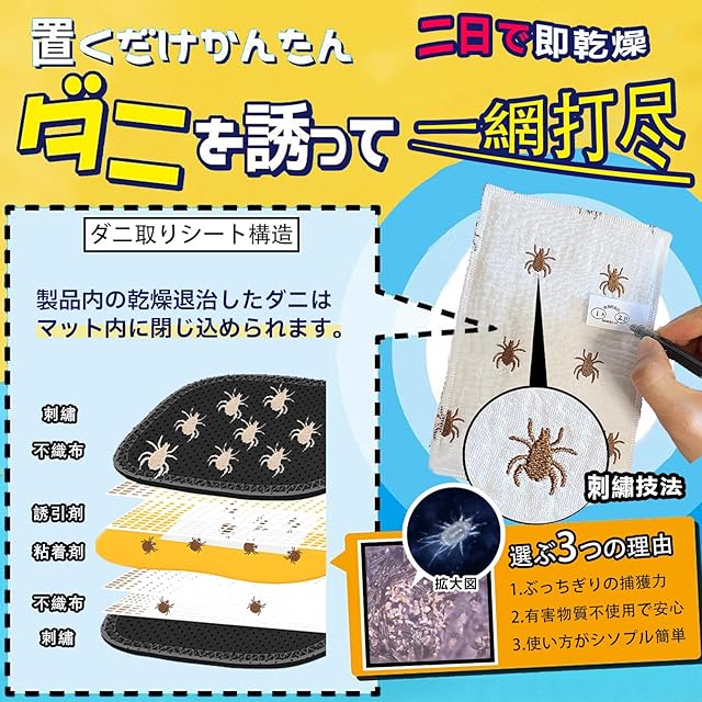 ✅【刺繍の技法】独特な刺繍工芸は、製品の品質を高めるだけでなく、見た目にも一層心地よく、心を惹きつけます 。置くだけ簡単、捕獲したダニごと捨てられるダニとりシート。ジャマにならない薄型シートで、ポンっと置くだけでダニへの効果は3ヶ月持続。たった5秒もあれば、ベッドや押入れ、ソファなどあらゆる場所でダニ対策が可能です。※1枚ずつ個別包装されております,使用環境により異なります。