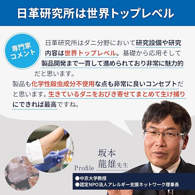 【専門家に認められた研究機関による製品】ダニ捕りロボは、「日革研究所」が開発する商品です。「日革研究所」は、専門家からも“ダニ研究の世界的権威"と認められた機関。先端の設備と蓄積された知見に基づいた高性能な製品づくりに取り組んでいます。