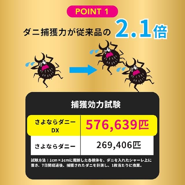 ●シリーズ最強の捕獲力。従来品の2.1倍。1枚で57万匹捕獲。(ラボデータ、メーカー調べ)●100%コットンはダニにとって居心地のいい環境を再現。一度入ったら出たくなくなる。●W誘引。従来品の誘引剤に加えダニが好む『タイプ別の香り』を独自開発。天然成分で殺虫成分ゼロ。安心素材でしっかり捕獲。