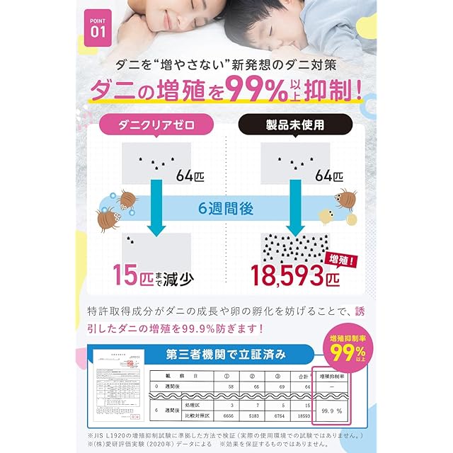 【ダニを増やさない!増殖抑制99% ✖ アレルギー抑制99%の新ダニ対策!】【赤ちゃんのいるご家庭にも安心してお使いいただけます】「ダニクリアゼロforBABY」は、赤ちゃんにもやさしい酵母由来の食品品質成分を使用した誘引剤を採用。ダニの好む栄養環境を再現することで、ダニを自然に引き寄せ、シートに集めてその場に居つかせます。さらにシート表面には、ダニが通過する際にその成長サイクルにする特殊な有用成分を配合。卵の孵化や成虫への成長を抑える働きがあり、ダニの数を減らすだけでなく、繁殖自体を長期間抑えることが可能です。赤ちゃんの寝具まわりにも多く見られるチリダニ類やツメダニなど、湿気を好む種類に着目して研究・開発されており、置いたその日からしっかり効果を発揮。シート1枚で約4ヶ月間使えるので、赤ちゃんのいる毎日の暮らしに無理なく取り入れられます。