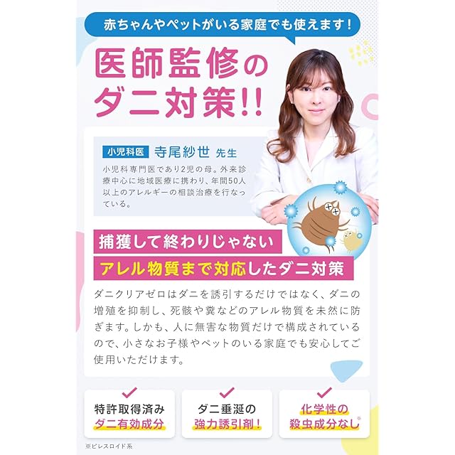 【大切なのは“繁殖させない”こと】ダニは1匹で約100個の卵を産み、25日で成虫に。放っておくとあっという間に数万匹に増殖してしまいます。だからこそ、今いるダニだけでなく、これから増やさないことが大切です。本製品に含まれるは、ダニの卵の孵化や成長を99%抑制する働きがあり、繁殖を根本からブロック。定期的に取り替えることで、子どもが過ごす空間を一年を通して清潔で快適に保つことができます。 【商品詳細】内容量 : 3枚入/サイズ:シート9×9cm、パッケージ16×21cm / 使用目安:約4ヶ月 / 日本製 / 30日付き。気になる場所に置くだけで、快適な生活をサポートします。 日付シール付きで交換時期がひと目で分かり、管理も簡単。天然コットンの不織布シート採用。さらにエサ型なので4ヶ月間の長期持続。ダニクリアゼロは心をこめて一つひとつ手作業で仕上げています。日々の暮らしを快適に過ごしていただくために、人にも環境にも優しい素材でダニのお悩みをクリアにする製品です。ダニに悩む方々の負担を少しでも軽くし、ご家族の大切な空間を守る一助となれば幸いです。