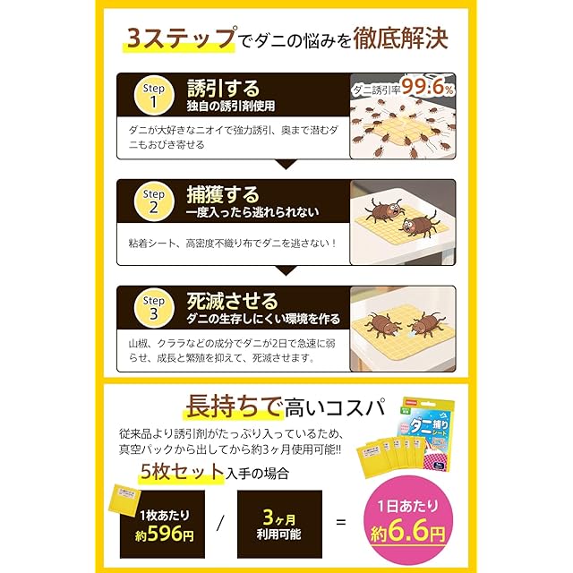 【効果は3ヶ月持続!使用後のお掃除不要!】従来品より誘引剤がたっぷり入っているため、約3ヶ月使用可能!!一日わずか6円(5枚セット入手の場合)でダニ取りでき、経済的!また、使用後は面倒な掃除や後処理がいらず、捨てるだけ、超便利!忙しい毎日でも続けやすいダニ対策です。