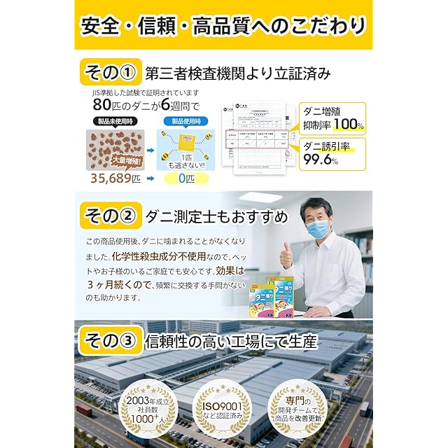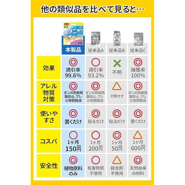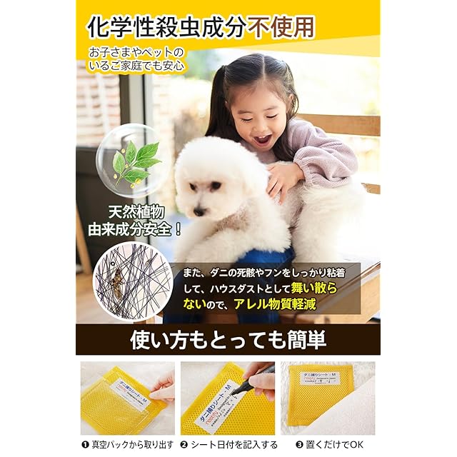 【化学性殺虫成分なし・アレル物質飛散防止】天然植物由来の安心成分で作られた誘引剤を使用してダニ駆除 、化学性殺虫成分は一切使用していません。小さなお子様やペットのいるご家庭でもご使用いただけます。厳選した強力粘着剤を使用、生きたダニはもちろん、ダニの死骸・フンもしっかりキャッチし、ダニアレルゲンが空気中に飛び散りません。アレル物質の発生源を減らし、快適な室内環境作りにも役立ちます。