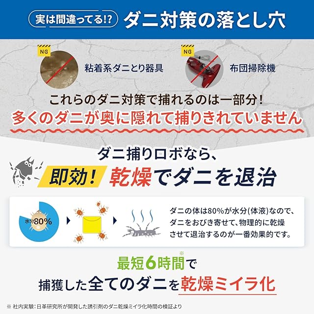 ※こちらは【詰め替え用】です。初めての方は本体商品をご購入ください。【独自技術で徹底退治! 】ダニ捕りロボは、ダニが好む香りで誘い寄せ、粘着式ではなく独自の乾燥技術で最短6時間でミイラ化。逃がさず確実に退治し、ダニの増殖も100%抑制。※ JISに準拠した「防ダニ試験(インテリアファブリックス性能評価協議会)」(調査機関:株式会社ビアブル,試験実施期間:2015年9月8日〜10月20日)