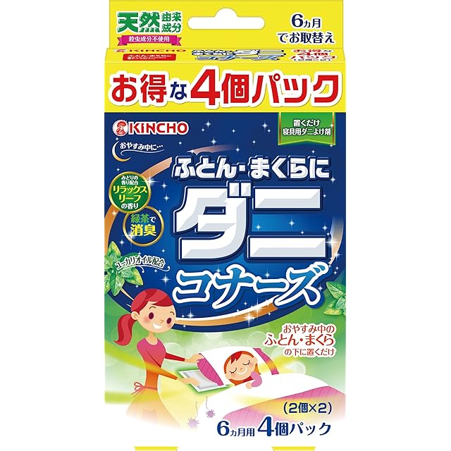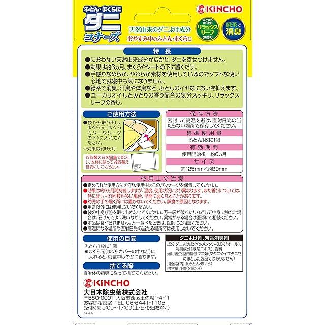 商品名:KINCHO ふとん・まくらにダニコナーズ ダニよけシート 4個入 リラックスリーフの香り