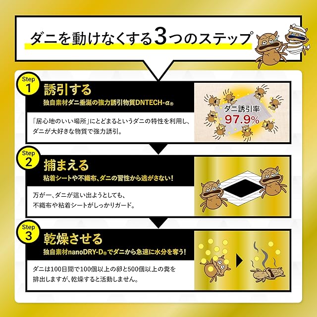 ✅ダニの誘引試験では97.9%のダニの誘引に成功。ダニシートから放たれるDNTECH-αがダニを誘き寄せます。国内ダニトリシートトップレベルの誘引力です。匂いは設置しても気にならない匂いで、日々の生活もストレスフリーで過ごすことが可能です。