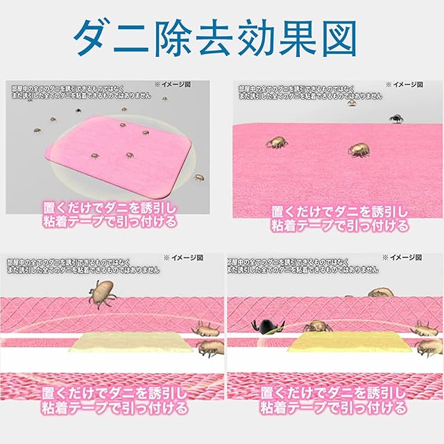 【適用場所】ダニが繁殖する場所(カーペット、マットレス、ソファクッション、収納ボックス、収納キルト、ワードローブ、マット、ペット用ベッド、クローゼット、その他のダニが集まる場所など)に配置します。※シングルベッドの場合、上下に1m程間隔をあけてマットレスと敷きバットの間に挟み込んでセット。