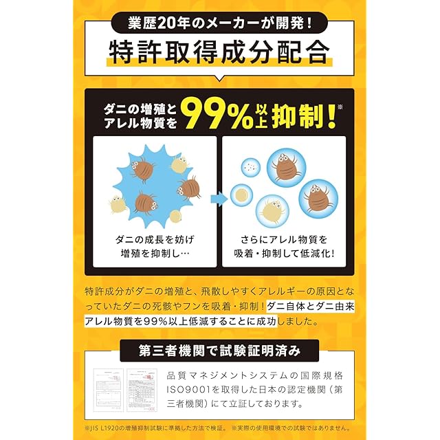 【アレル物質を99.8%※低減!増殖抑制99.9%!快適な空気環境をサポート】 ダニそのものよりも、不快感を引き起こす主な原因は“ダニの死骸”や“フン”であると言われています。とくにフンには消化酵素などのタンパク質が含まれており、これらが乾燥して空中に浮遊すると、鼻や喉、皮膚に反応を起こす可能性があると言われています。本製品にはアレル物質と結合し、その構造を変化させる独自成分を配合。IgE抗体と結合しにくくなることで、反応の引き金となるリスクを抑える設計になっています。アレル物質対策としても、すでにダニに悩まされている方の「今ある不安」と、今後の「予防」の両面に寄り添う製品です。チリダニなどの死骸やフンが原因とされる、くしゃみ・鼻水・目のかゆみ・咳などの対策にお役立ていただけます。 ※第三者機関による評価試験データに基づく