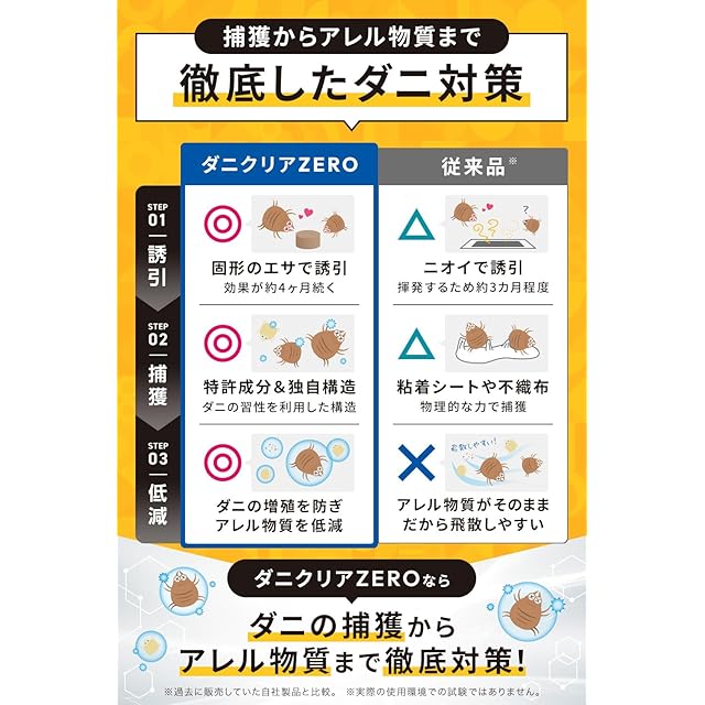 【ダニを増やさない!増殖抑制99% ✖ アレルギー抑制99%の新ダニ対策!置いたその瞬間から】 「ダニクリアゼロ アレルギーストップα」のダニ取りシートは、酵母由来の食品品質成分を使用した誘引剤を採用。ダニの好む栄養環境を再現し、強力に引き寄せてその場に居つかせることで、的確にダニをシートへと集めます。また、シート表面には、ダニが通過した際にその成長サイクルにする特殊なが含まれており、卵の孵化や成虫への成長を抑制する働きがあります。これにより、ダニの数を減らすだけでなく、繁殖を長期的に抑えることができます。一般家庭に多く見られるチリダニ類やツメダニなど、湿気を好む種類を中心に研究を重ねて開発され、置いたその日から効果を発揮する設計となっています。シート1枚で約4ヶ月間使用でき、季節を問わず一年を通した継続的な対策に適しています。ダニからあなたも大切なご家族も守ります。