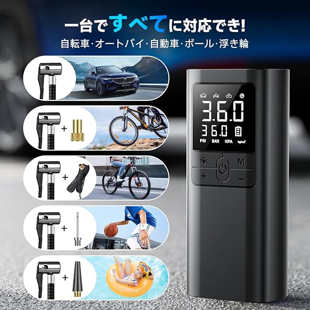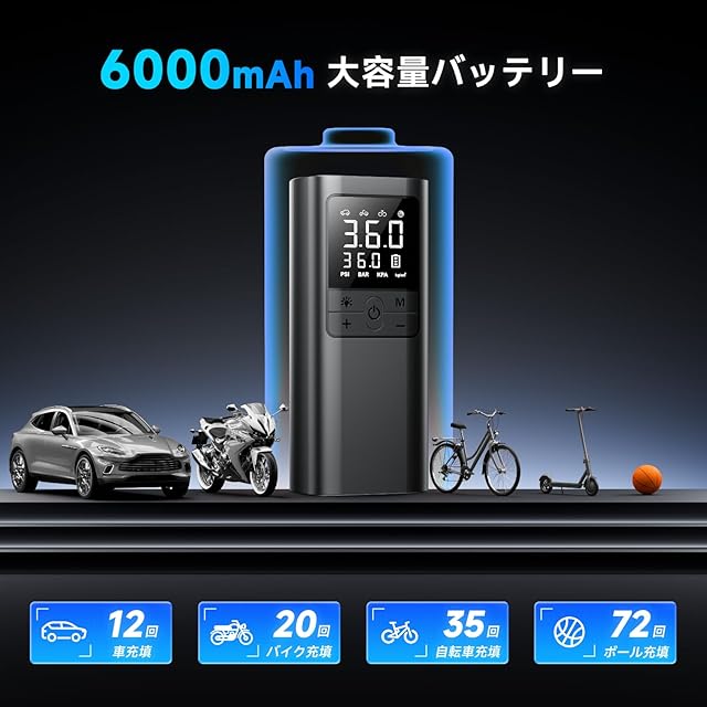6000mAhの大容量 & 1分で充填:この電動空気入れは6000mAhの大容量バッテリーを搭載しており、2.5時間でフル充電されます。 フル充電で、自転車用タイヤに35回、バイク用タイヤに20回、自動車用タイヤに12回、バスケットボール用タイヤに72回空気を入れることができます。毎分25000回転のターボコンプレッサーとして効率が従来の電動空気入れより8倍も上がり、ボールを10秒で、タイヤを1分で充填できます。 車、バイク、自転車、ボールのタイヤなど、さまざまな空気充填に適したアクセサリーがあります。旅のお供にもなりますし、運動場にも欠かせない空気入れです。