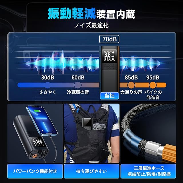 5 in 1 タイヤ空気入れ:この空気入れは単なるタイヤポンプだけではありません。空気入れ上部にはLEDライトがついており、暗い場所での空気充填やタイヤの交換、夜間の車への警告に便利です。下部にtype-c充電口と5V/2A USB出力口があり、電子機器のモバイルバッテリーとしても使えます。最大圧力150 PSIと自動停止機能があり、目標の圧力に達すると自働的にオフし、タイヤの過剰充填の心配はありません。タイヤの圧力を測定することができます。空気入れの電源がONの場合で、タイヤの空気口を接続すると、現在のタイヤの圧力が表示されます(英式ノズルのタイヤは対象外)。本体の左右両面に排熱穴、内部に換気排熱を設置しており、熱量散発に効果的。優れた3重排熱構造で長時間使用しても熱くなりません。安全に使用できるよう設計されています。