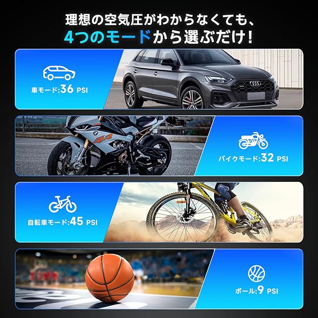 4+N スマートモード & コンパクト:この自転車空気入れ は4+Nスマートモードを備えています。4つのスマートモードは、車モード、オートバイモード、自転車モード、ボールモードです。また、カスタムモードでは、異なる空気に応じて必要な圧力を設定することができます。また、そのコンパクトなサイズは簡単に車、自転車ラックやパックに入れることができます。