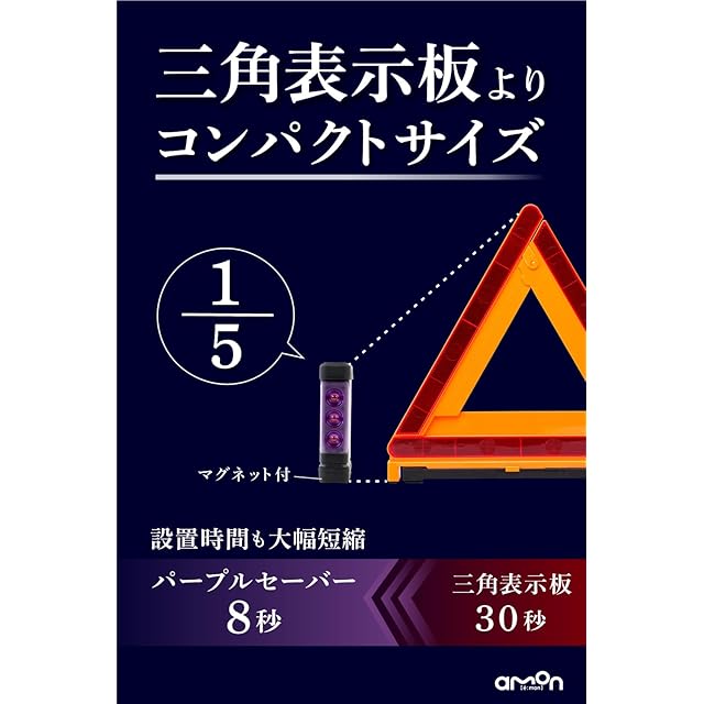 【パープルセーバー】◆高速道路における緊急停車時、三角表示板の代わりに設置できる道路交通法施行規則適合品。◆夜間約1,000m以上、昼間約400mから強力発光で存在を知らせる安心の視認距離(※乾電池残量や道路環境により異なります)。◆底面がマグネットなので、車内から車のルーフに安全に設置できる。シリコン製の防水カバーにより、車体への傷付きを防止、雨天時のトラブルにも対応。◆車の運転席周りやバイクのシート下などに収納できるコンパクトサイズ。◆専用ホルダーで車内にスッキリ設置。◆連続使用約8時間でトラブル発生から事後処理までしっかり点滅(※ 新品アルカリ乾電池を使用した場合)。◆バイクでもお使いいただけます。
