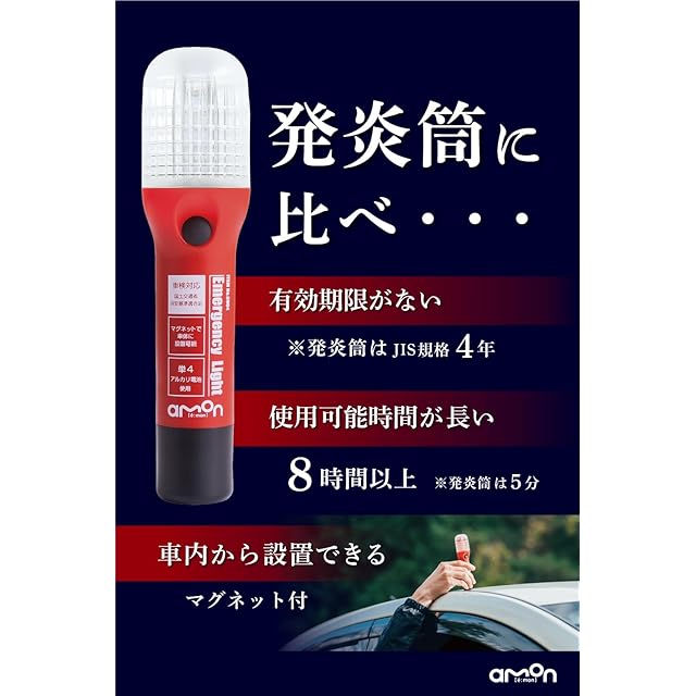 【非常信号灯】◆緊急停車時の二次的事故防止に。発炎筒の代わりに車載できる車検対応品。◆有効期限がなく、電池交換で繰り返し使える。◆夜間約200m先からでも確認できる強力発光。◆連続使用約8時間(新品アルカリ乾電池を使用した場合)◆緊急時でも直感的に操作しやすいスイッチ形状。