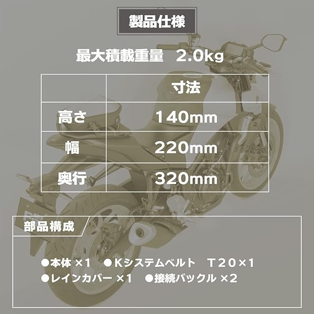 内容:本体×1(MFK-288)、KシステムベルトT20×1(MP-302)、レインカバー×1(MP-341)、接続バックル×2(MP-105)