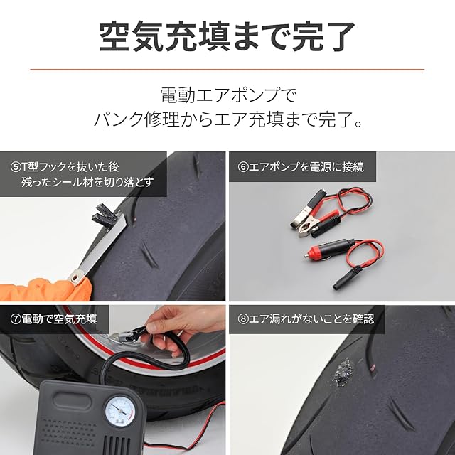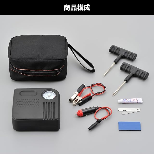 【構成部品】T型リーマーx1、T型フックx1、カッターx1、ラバーセメント(8g)x1、タイヤシール材x5、エアインフレーター、ワニ口クリップコード、シガープラグコード、収納ケースx1