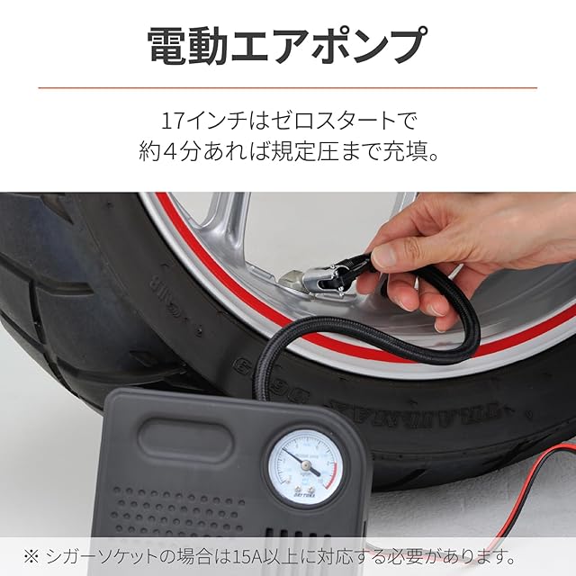 【仕様2】バッテリー電源駆動の12V電源エアポンプ付きだから、タイヤのエアを簡単に補充できます。
